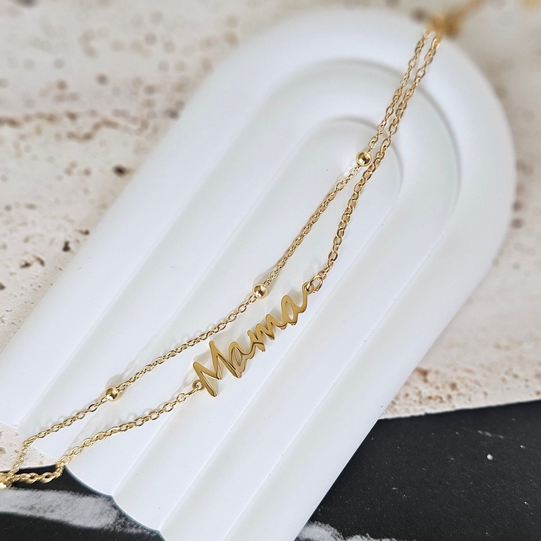 Introducing our Mother's Day Exclusive — Mama Double Layer Bracelet, crafted to honor the love, strength, and beauty of every mother. This stunning bracelet features two delicately layered chains, highlighted with a chic "Mama" pendant that makes a subtle yet powerful statement.
