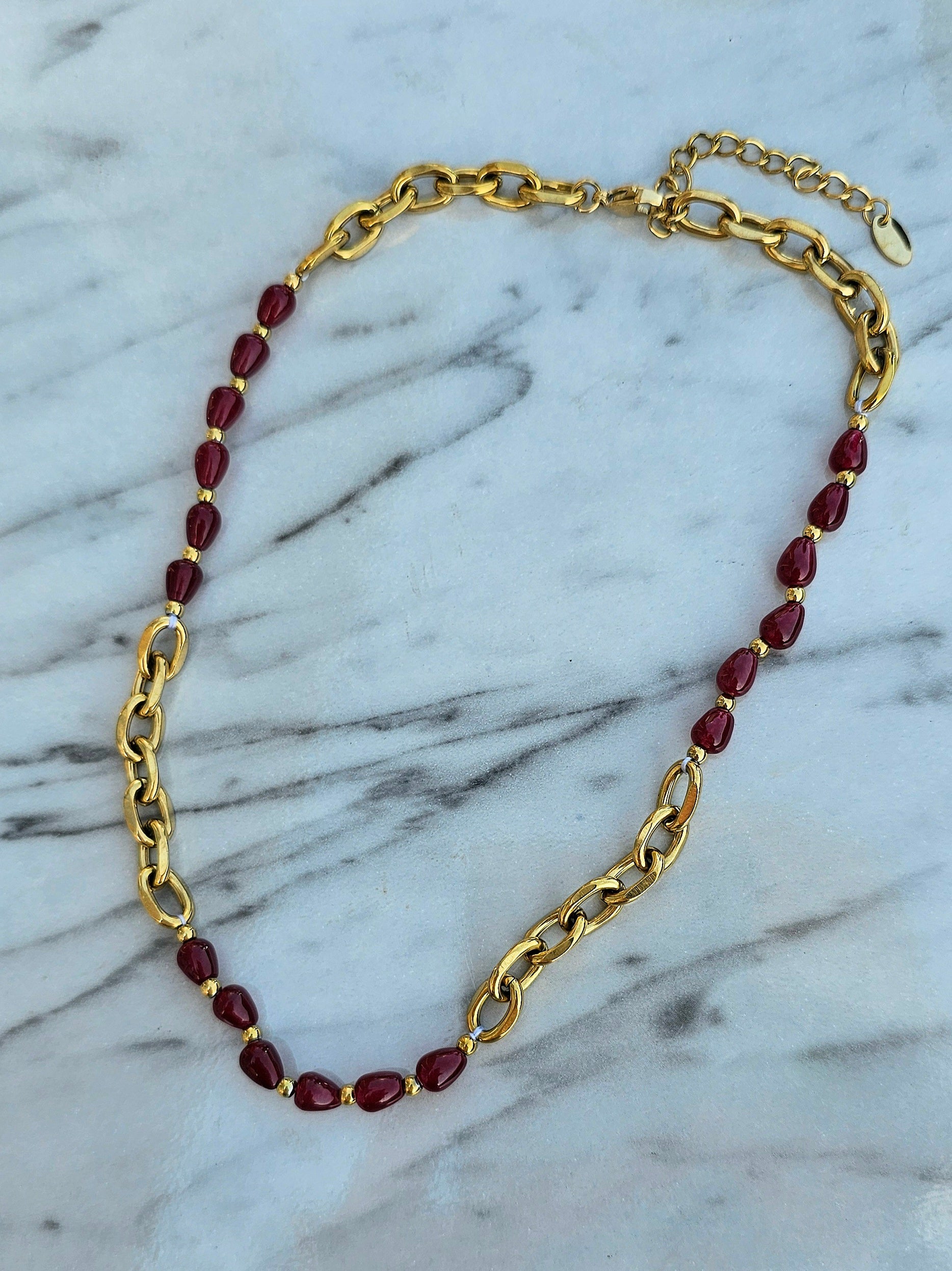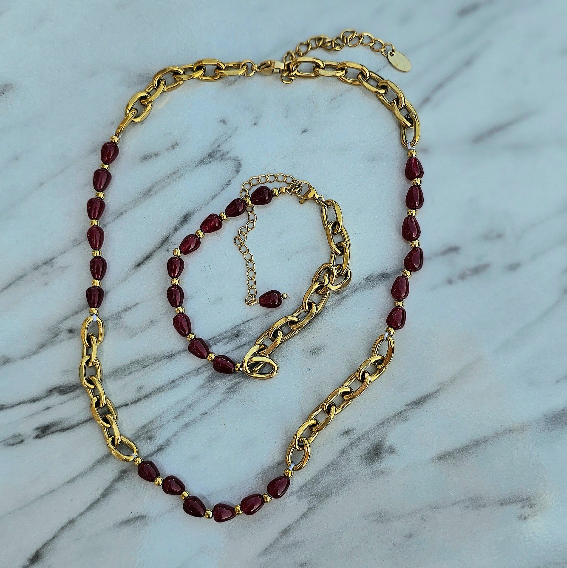 Bring subtle charm to your neckline with the Pomegranate Chain Necklace, featuring a finely crafted gold-plated chain inspired by the richness and beauty of the pomegranate. Delicate yet eye-catching, this necklace is perfect for layering or wearing on its own for a simple, refined touch. Lightweight and versatile, the Pomegranate Chain Necklace adds a timeless glow to any outfit, from casual days to special occasions.