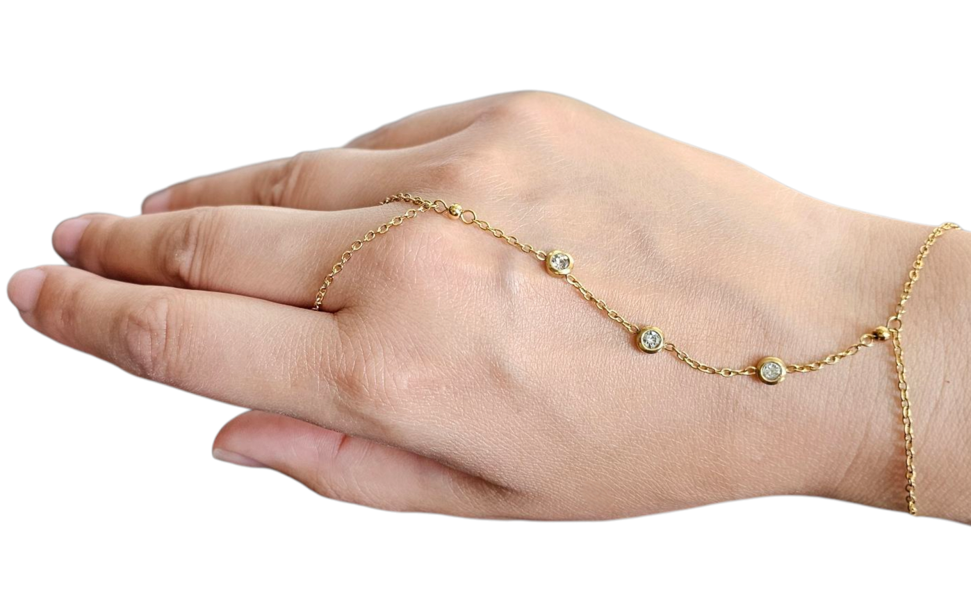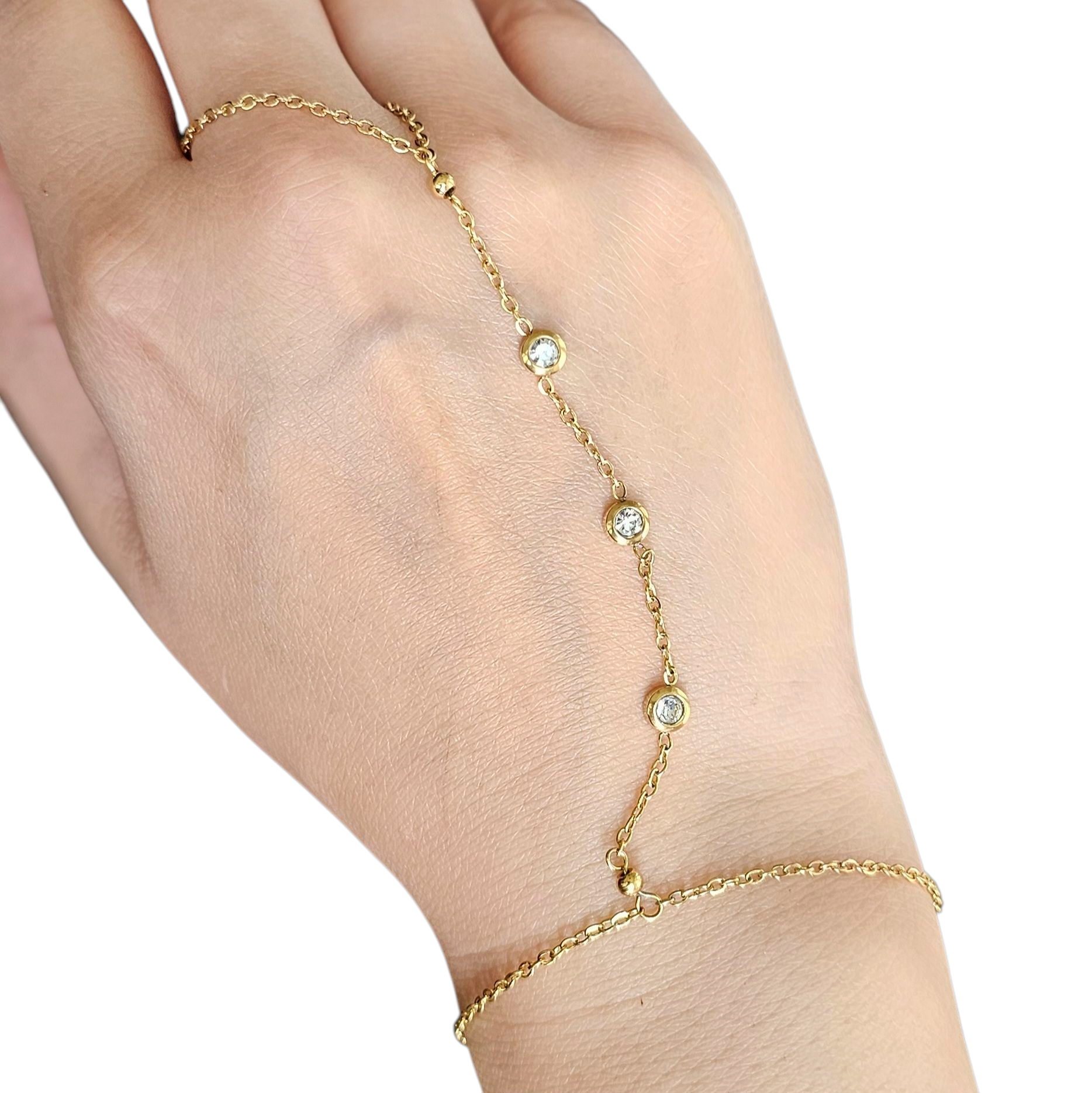 The Ayla Handchain is a modern statement of grace — blending the elegance of a bracelet with the delicate touch of a ring. Designed for the minimalist who loves to stand out, this gold-plated handchain drapes beautifully across the hand, making it a stunning choice for events, photoshoots, or daily wear.